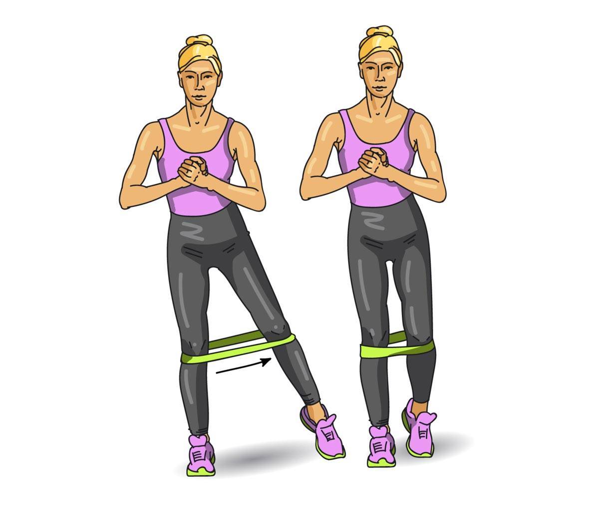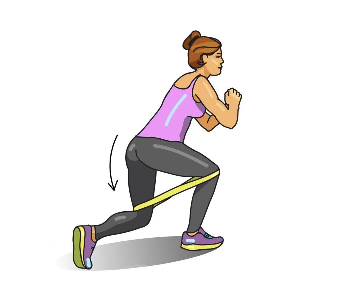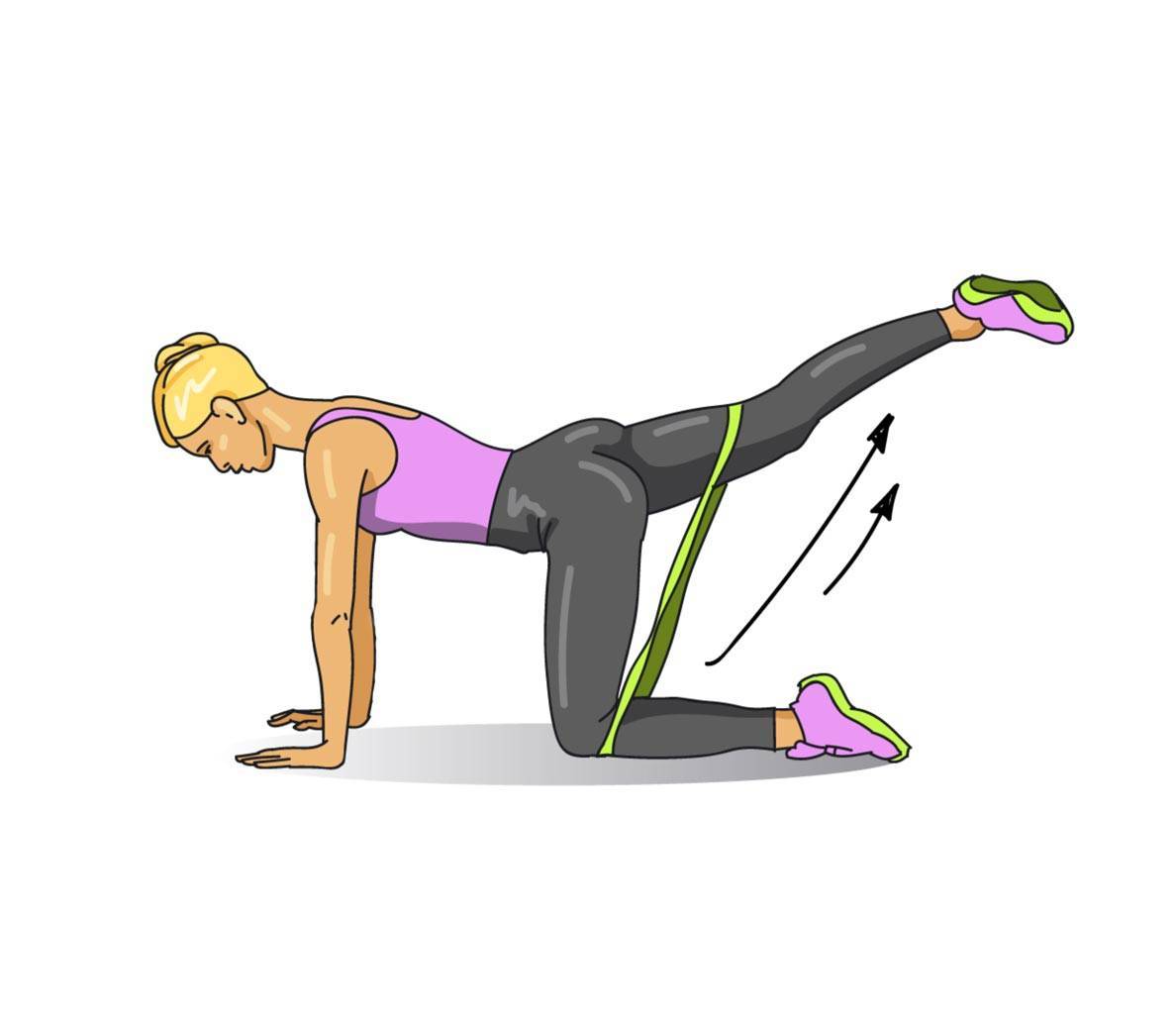 Встаньте ровно, затем примете положение полуприседа. На выдохе отведите ногу с резинкой назад. Задержитесь в этой позиции, как можно сильнее напрягая ягодицы. Вернитесь в исходное положение и повторите для другой ноги.
