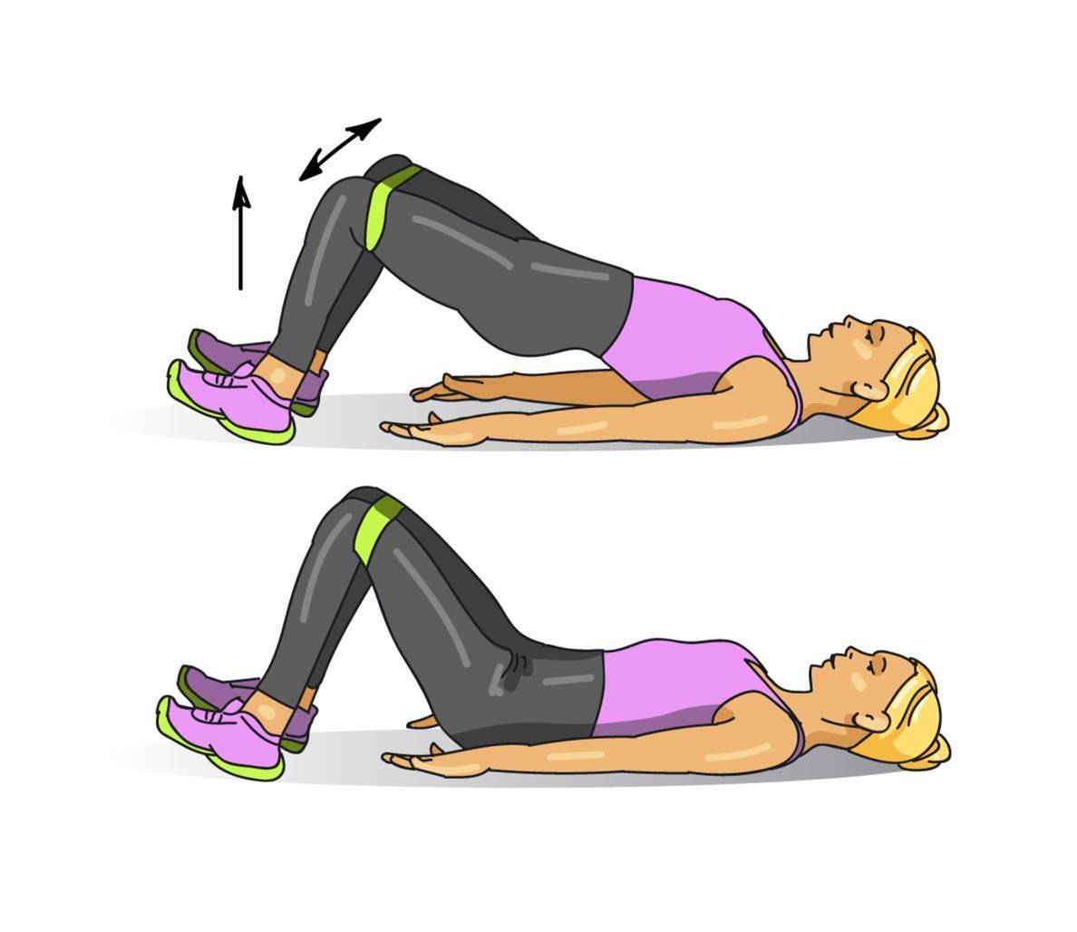 Упражнение воздействует как на ягодичные мышцы, так и на мышцы нижнего пресса. Исходное положение — лежа на спине, руки вдоль тела. На выдохе медленно поднимите таз вверх, затем разведите бедра в стороны. Задержитесь в таком положении, ощущая работу пресса и ягодиц.