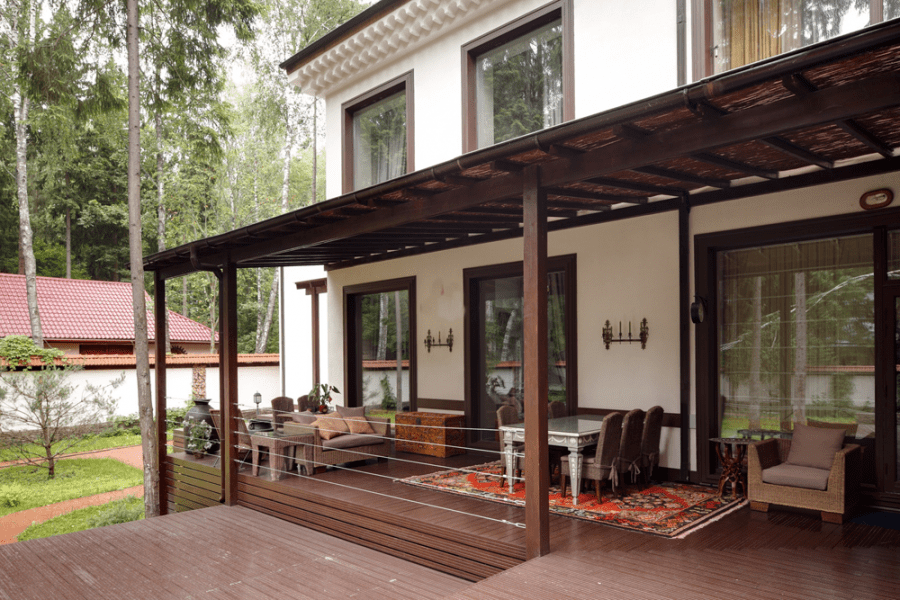 Деревянная терраса состоит из деревянных реек, настилов, прикрепленных к конструкции.