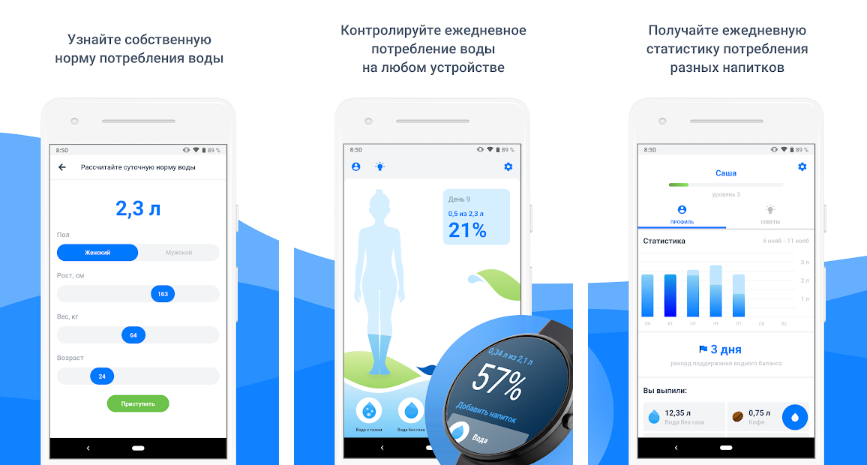 Похожие приложения: BeWet, «Моя вода», «Водохлеб», «Вода, здоровье и водный баланс».