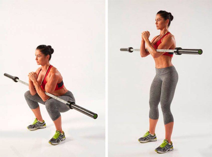 Штангу необходимо разместить на стойках на уровне живота. Затем возьмите ее на локтевые сгибы, крепко сцепив руки перед собой. Снимите штангу со стоек и сделайте шаг назад. Согните ноги в коленях, стараясь опуститься как можно ниже. Но с учетом всех требований к приседаниям, особенно к пояснице. Энергично разогните ноги. Повторите не менее 6-12 раз.