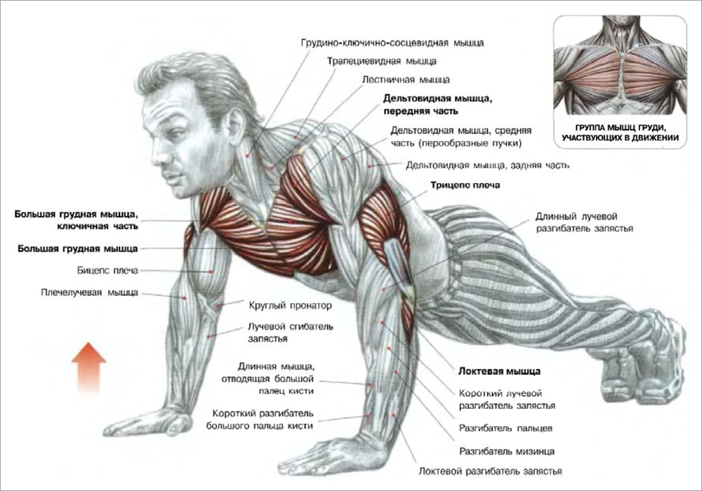 Еще раз напомним, что при отжиманиях должны работать не только мышцы груди, но и, по сути, всего тела