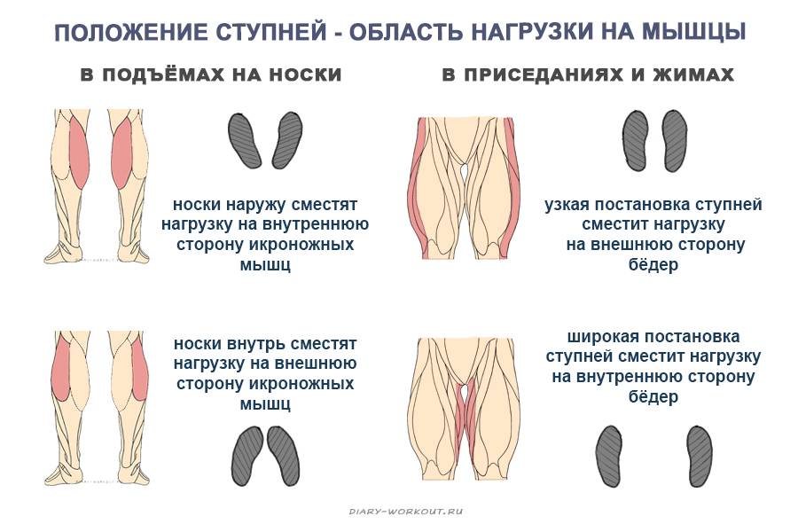 - При выполнении упражнений на ноги, изменяя положение ступней, можно добиться смещения нагрузки на наружную или внутреннюю область мышц. В приседаниях или жимах ногами нагрузка сместится на внешнюю или внутреннюю область мышц в результате узко или широко расставленных ступней. В подъёмах на носки нагрузка изменяется, если носки направлены внутрь или наружу.