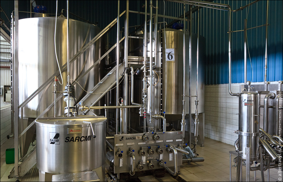 В случае производства сладких напитков здесь есть шесть купажных емкостей, где готовят сиропы, которые добавляются в воду.