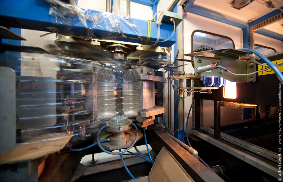 Выдуваются они вот в такой машине. Общая производительность цеха выдува — 9 тыс. бутылок различной вместимости, формы и цвета в час.