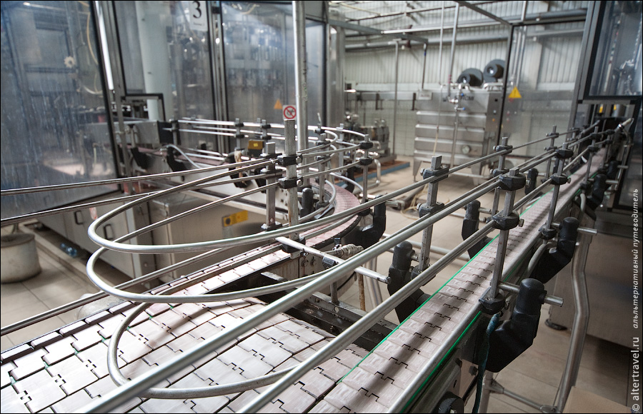А вот конвеерная линия, по которой выдутые бутылки перемещаются к следующему агрегату.