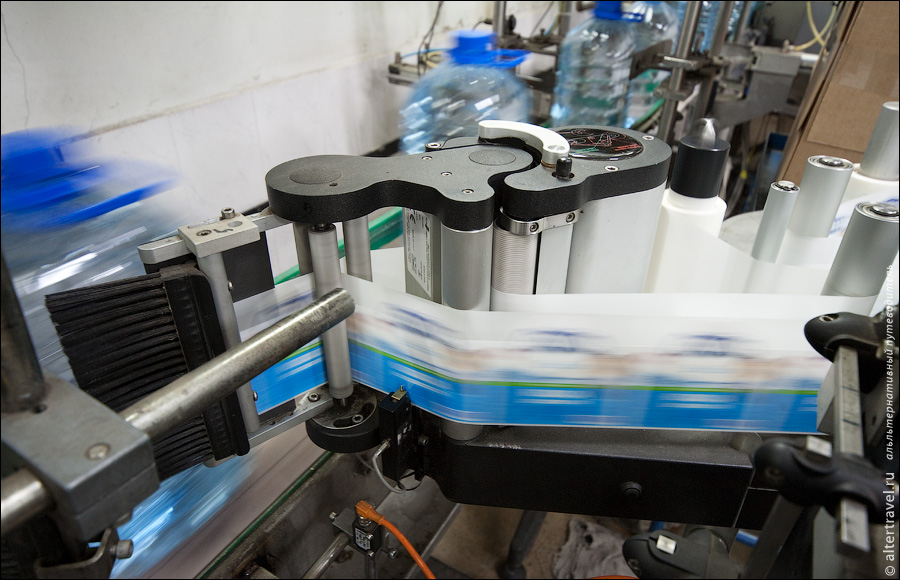 Далее по конвейеру бутылки передвигаются в аппарат наклеивающий этикетку.