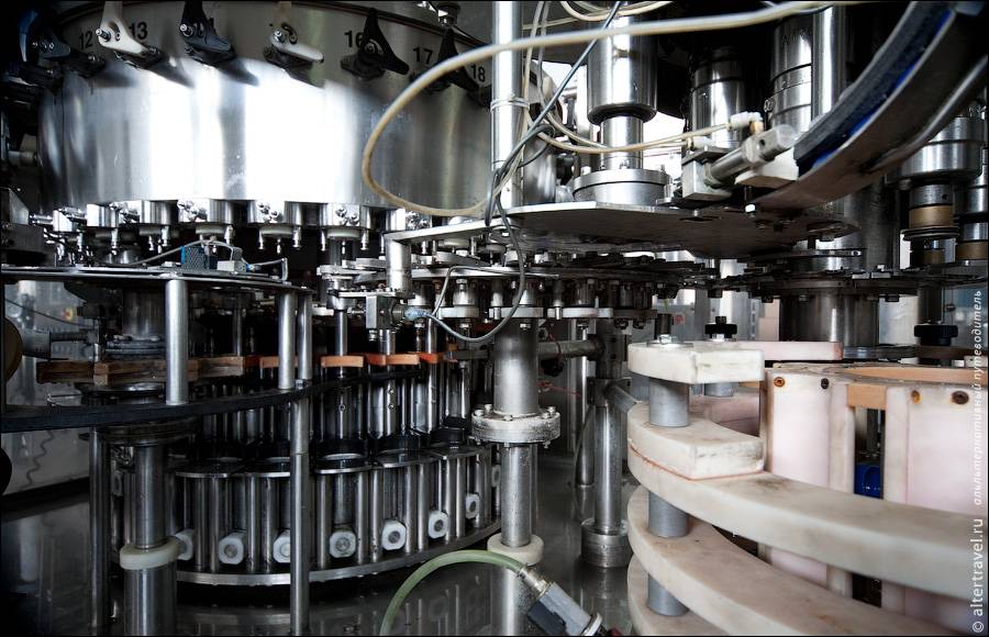 Внутренности разливного аппарата, бутылки здесь продвигаются по двум окружностям, сначала промываются, затем их заливают и сразу закручивают пробку.