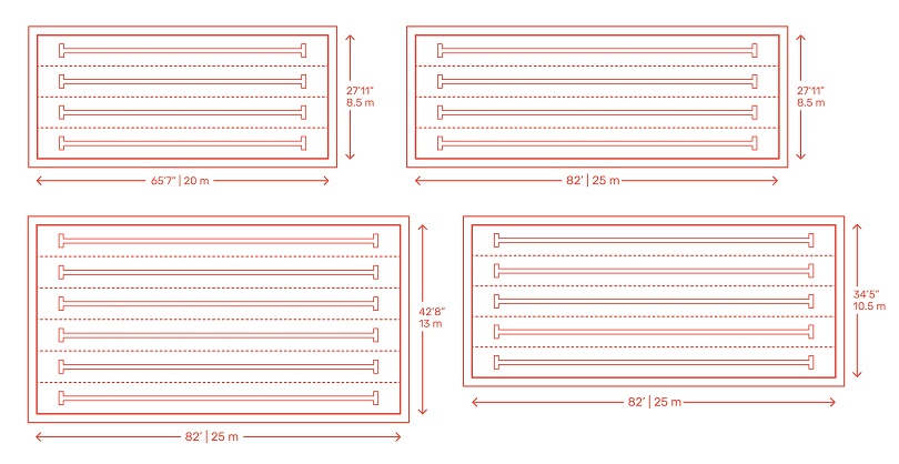 Чертежи плана с размерами различных размеров для общественных бассейнов с несколькими типами дорожек