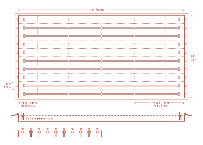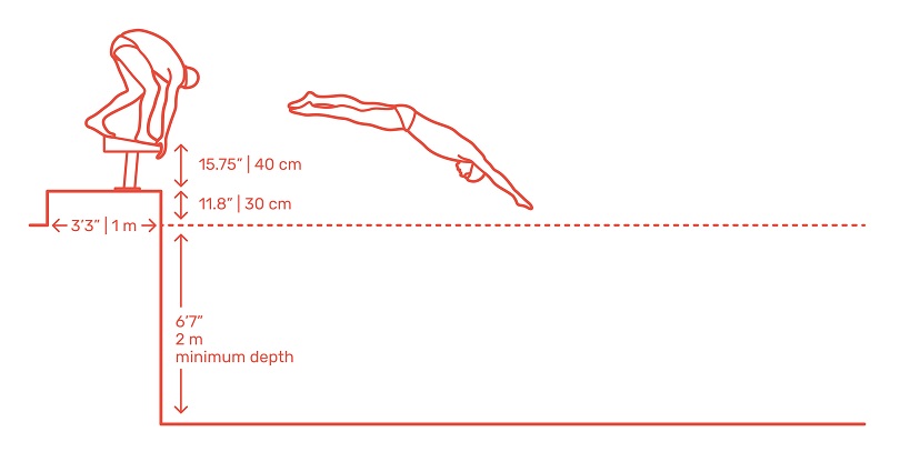 Размерная иллюстрация бассейна со стартовым блоком с пловцом, ныряющим в масштабе.