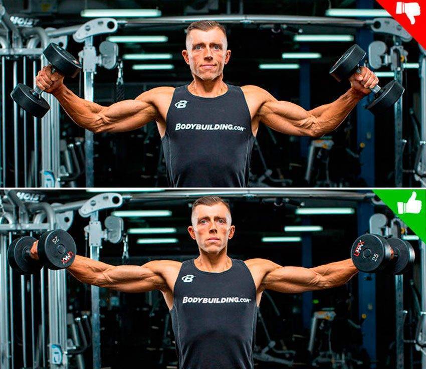 - Неправильна осанка. Не нагибайте туловище назад и вперед. Спину поддерживайте строго прямо. Помните, что вся работа мышц происходит исключительно в плечах. Все остальные подвижные части во время тренировки этих мышц должны находиться зафиксированными. Обычная ошибка, которую очень легко совершить — поднимая руки, вы немного раздвигаете кисти не совсем в стороны, а, помогая себе, немного вперед. Из-за этого вы начинаете неосознанно наклонять туловище вперед, чтобы при обратном движении помочь торсом себе поднять гантели.