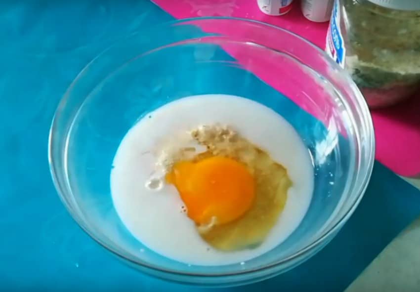 Вливаем молоко, добавляем яйцо. Бросаем одну-две щепотки соли, по желанию добавляем немного перца. Взбиваем вилкой до объединения компонентов.