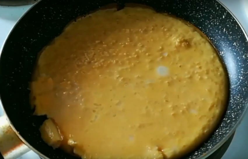Выливаем смесь на холодную сковороду с хорошим антипригарным покрытием, включаем медленный огонь и готовим до появления пузырьков.