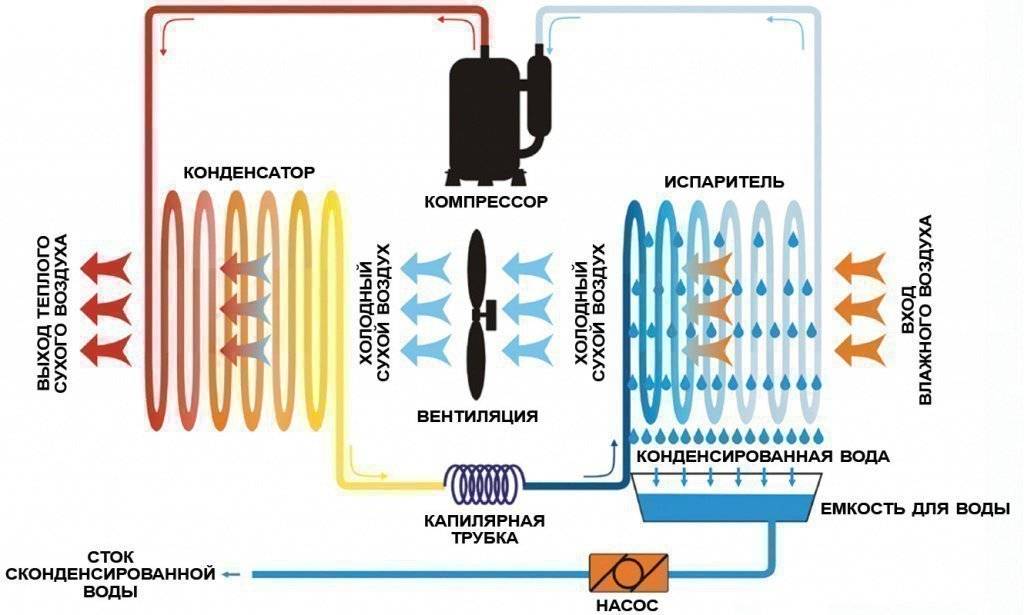 - Лишняя влага конденсируется и вентилятором прогоняется через осушитель обратно.