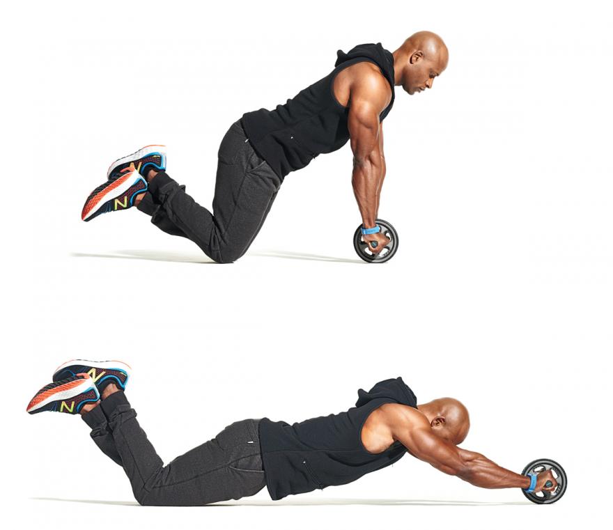 Подложите под колени мягкий коврик. Встаньте на колени, возьмитесь за рукоятки ролика и плавно катите его вперед, то момента, как ваше туловище будет полностью выпрямленным. Затем катите ролик назад и вернитесь в исходное положение.