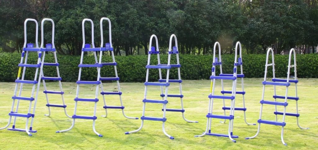 Приспособление используется для резервуаров, которые устанавливают на поверхности. Одна часть опирается на дно, а вторая – на поверхность около борта. Можно снять или поднять блок ступенек, благодаря чему дети не смогут пользоваться лестницей без взрослых.