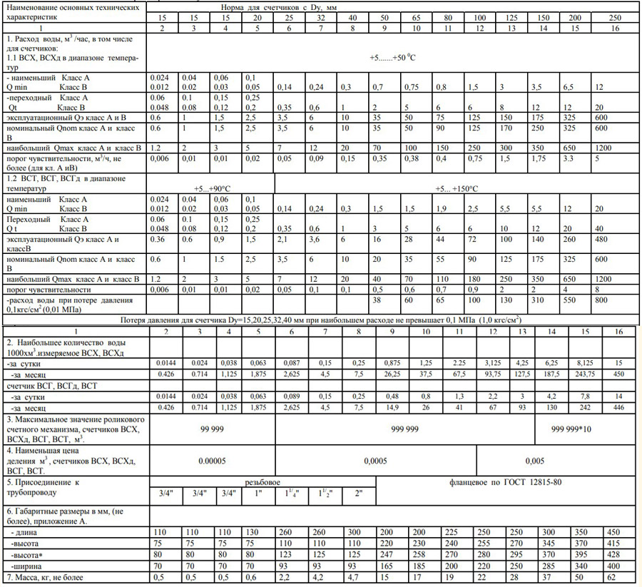 Для дистанционной фиксации потребления холодной воды используются модели счётчиков воды серии ВСХд. Такие приборы очень легко установить, а в процессе эксплуатации они не вызывают нареканий в течение всего межповерочного интервала. Такие изделия отличаются друг от друга, прежде всего, по пропускной способности, поэтому выбирать прибор следует из предполагаемого расчёта потребления холодной жидкости. Водосчётчики ВСХд имеют следующие характеристики: