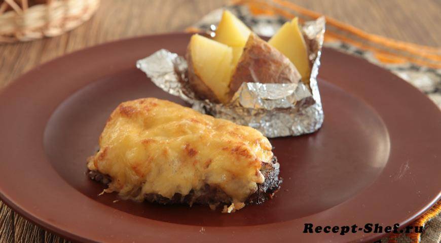 Перед подачей выложите на блюдо порционный кусочек запеченного мяса. С мясом подавайте картофель, раскройте фольгу и сделайте в картофелине глубокий надрез ножом, посолите и аккуратно присыпьте зеленым луком либо другой укропом — на ваш вкус.
