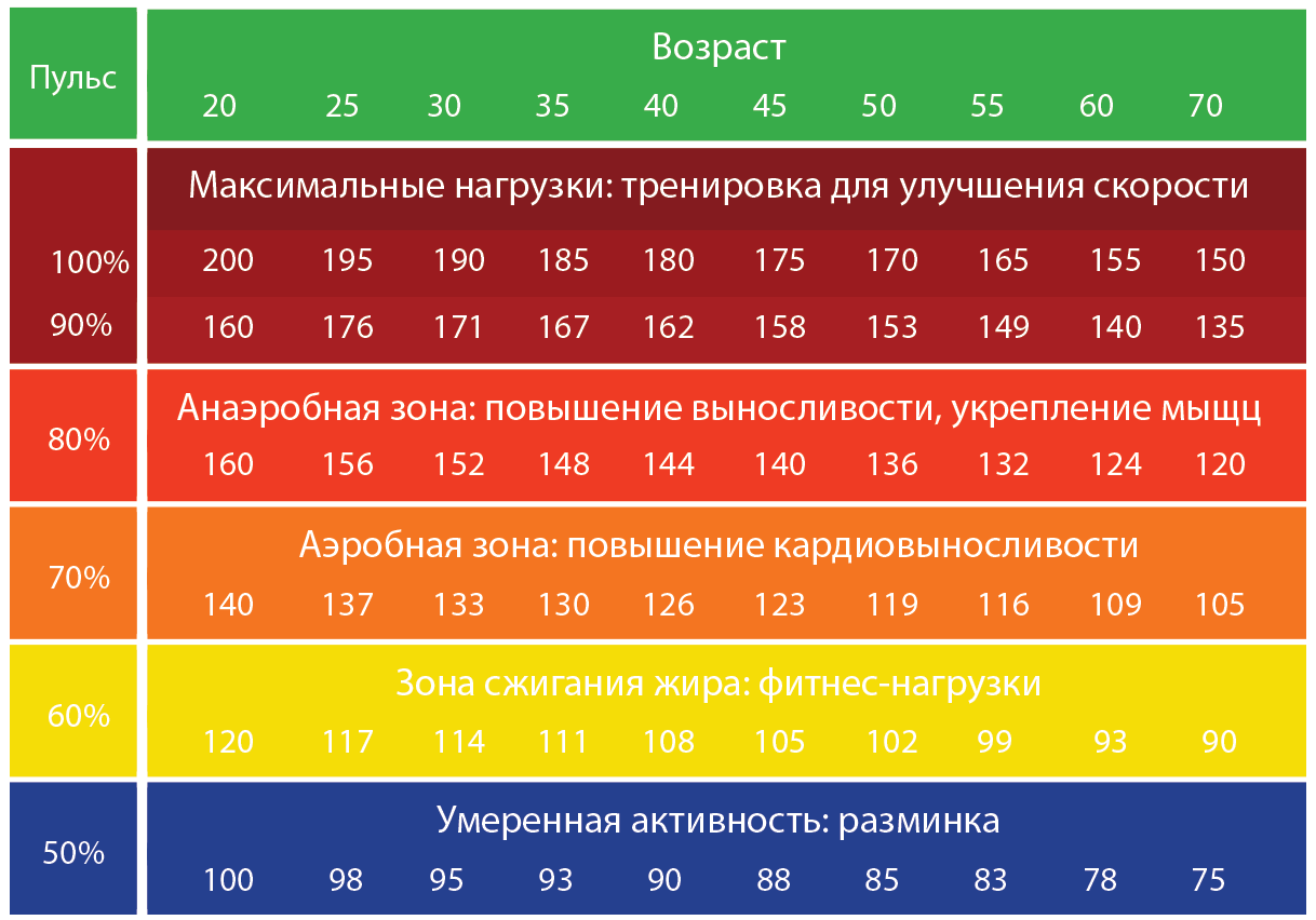 Итак, вы грубо прикидываете свои пульсовые зоны с помощью такой таблички или интерактивного калькулятора, а дальше во время тренировки держите пульс не ниже зоны сжигания жира, а в идеале — не ниже аэробной зоны (не перегружайтесь, берегите колени). Как мы уже говорили в разделе про тренировки, желательно чередовать «объемные тренировки» — длинные дистанции, которые стоит ходить на среднем пульсе, — и интервальные тренировки, когда вы делаете короткие рывки на пределе возможностей и пульса.