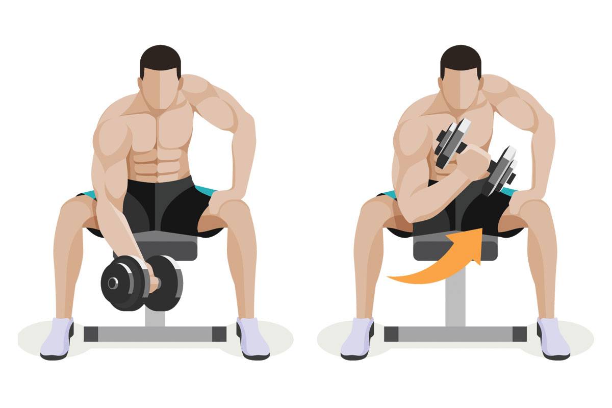Одно из лучших изолирующих упражнений на бицепс. Во время выполнения локоть зафиксирован и плотно опирается на внутреннюю часть бедра — это помогает усилить нагрузку на мышцы бицепса.