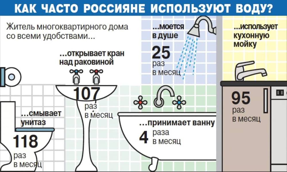 В расчетах услуг по нормативу также применяются количественные показатели бытового расходования воды в благоустроенных квартирах. На среднестатистического потребителя приходится следующее количество подходов в месяц:
