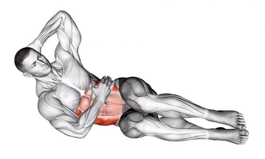 Лягте на наклонную скамью. Положите одну руку на затылок, вторую – на бедро. На выдохе делайте скручивание, разворачивая корпус влево, пока правый локоть не коснется левого колена. Повторите необходимое количество раз и поменяйте стороны.