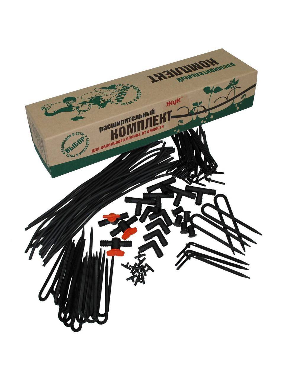 Благодаря дополнительным шлангам и капельницам способен обеспечить полив 80 растений. В набор включены уголки, тройники и заглушки, позволяющие удобно организовать пространство и смонтировать систему самостоятельно. Инструкция проста и доступна даже начинающему садоводу. Принцип обслуживания соответствует базовому набору, но емкость с водой придется установить на большую высоту (до 2 м).