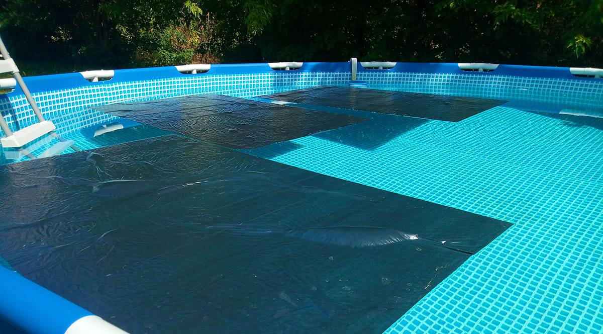 Решить температурную проблему в бассейне можно несколькими способами. Самый бюджетный из них использование солнечной энергии для нагрева поверхности воды. Цель, не дать отразиться солнечным лучам от воды и светлых частей бассейна. Для этого продаются специальные пленки стоимостью несколько тысяч рублей, но по опыту, копеечный пакет для мусора тоже справляется с этой задачей.