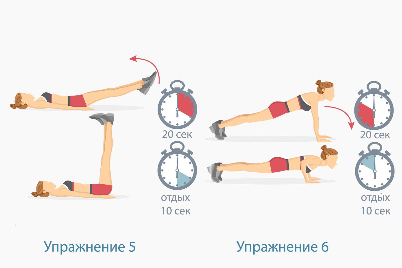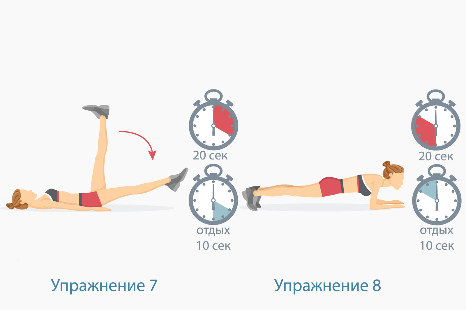 Следующее упражнение — опускание прямых ног лежа. Во время выполнения держите пресс в напряжении и не отрывайте поясницу от пола. Если вам тяжело, согните ноги в коленях. Второе упражнение цикла — отжимания от пола. Выполняйте 20 сек, затем 10 сек отдых — каждое упражнение цикла повторите дважды.