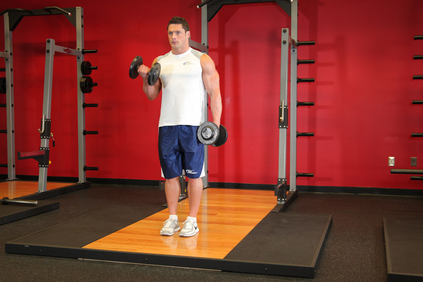 - В позиции стоя поочередно сгибаем локти, поднося гантели к плечам.