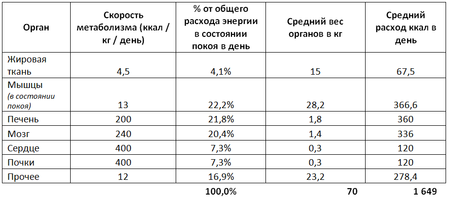 Вот хорошая иллюстрация соотношения массы органов и тканей к энергозатратам организма в состоянии «покоя»:
