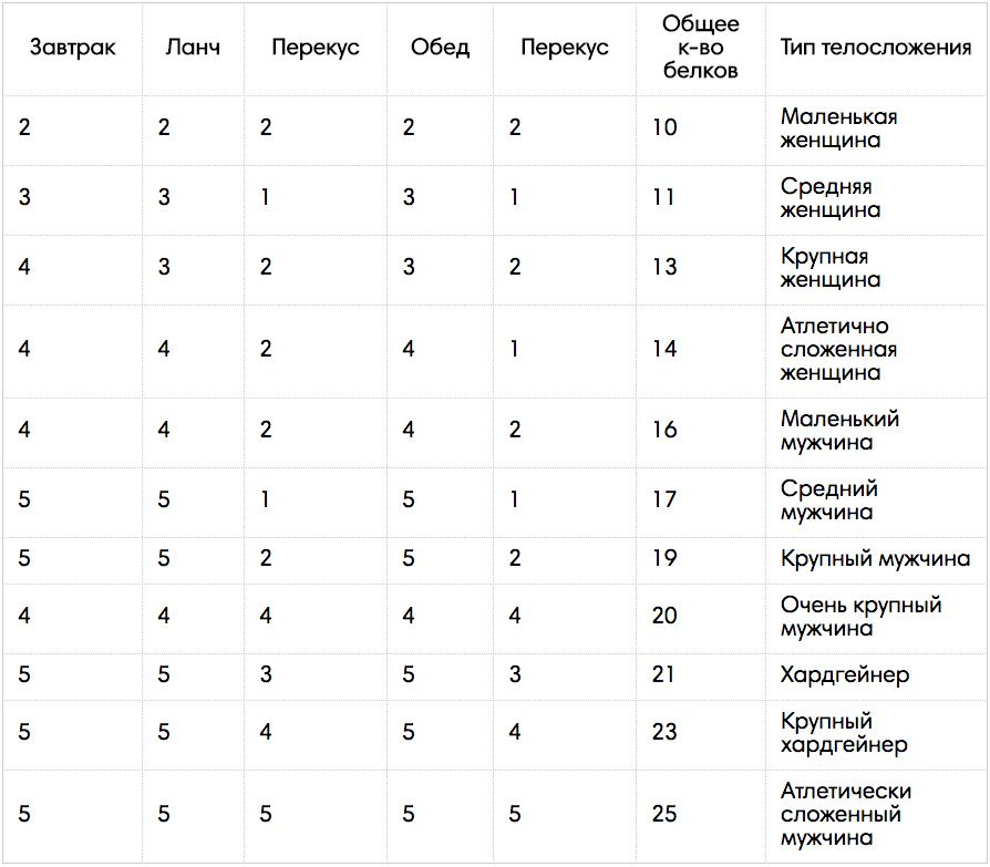 Выберите ваш тип сложения в таблице ниже, чтобы определить, как много блоков вам необходимо употребить в рамках пяти приемов пищи