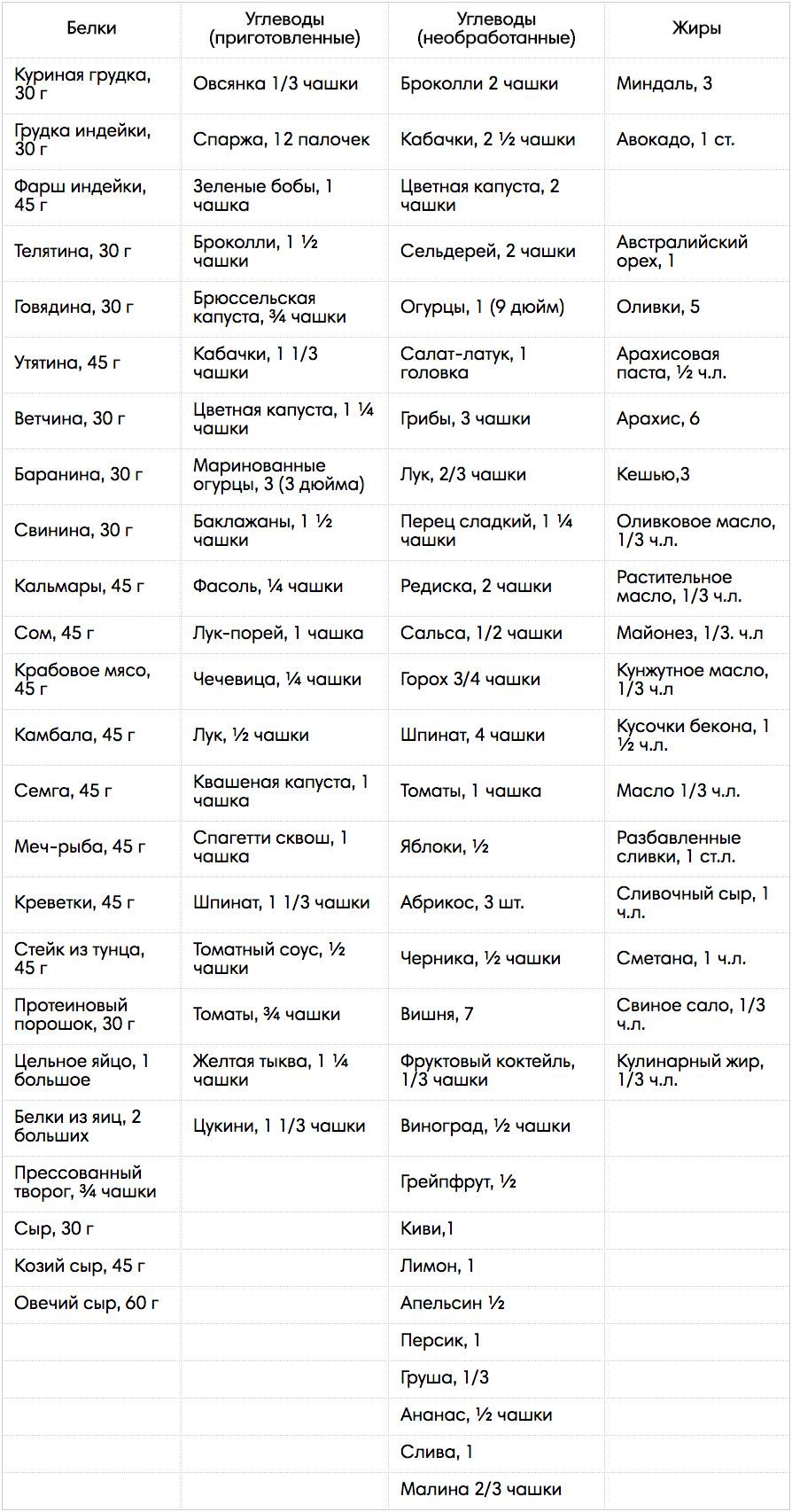 Если вы остановите свой выбор на схеме из 4 блоков, обращайтесь к таблице (смотрите ниже), где можно выбрать четыре наименования из категории углеводов, жиров, белков. Также подбираются снэки из первого блока. Снэк и прием пищи в равном соотношении обязаны содержать белки, жиры, углеводы. Если продукт позиционируется «без жиров», его количество следует удвоить. блока и т.д.
