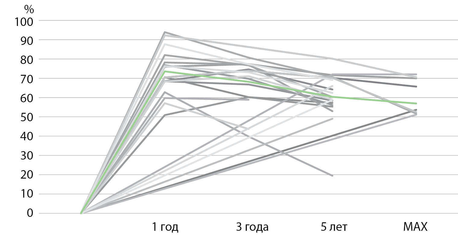На приведенном графике видно, что при наличии данных для каждой точки наблюдения, максимальный эффект операции развивается к 1–2-му году наблюдения в послеоперационном периоде, с постепенным снижением данного показателя к максимальному зарегистрированному авторами сроку наблюдения, что соответствует существующим представлениям о течении послеоперационного периода (рис. 3).