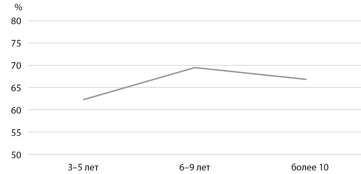 По данным проведенного анализа источников при сроке наблюдения от 3 до 5 лет, процент follow up в среднем оказался равным 62,3% (17 источников), при сроке наблюдения от 6 до 9 лет — 69,4% (7 источников), 10 лет и более — 66,8% (3 источника), в прочих — не описано. В данной ситуации ожидаемо было увидеть максимальный % follow up в наиболее ранние сроки наблюдения за пациентами и постепенное снижение % follow up с течением времени, однако, по полученным нами результатам, данного снижения не произошло. По-видимому, это связано с несколькими факторами, в том числе количеством статей в каждой подгруппе и однородностью данных внутри них. Имеющаяся тенденция изображена ниже (рис. 2).