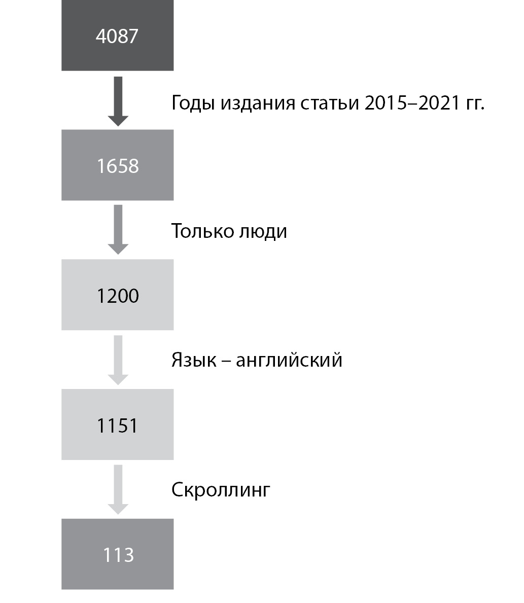 В сумме по результатам поиска в базах данных выделено 94 статьи, аннотации которых были просмотрены авторами независимо друг от друга.