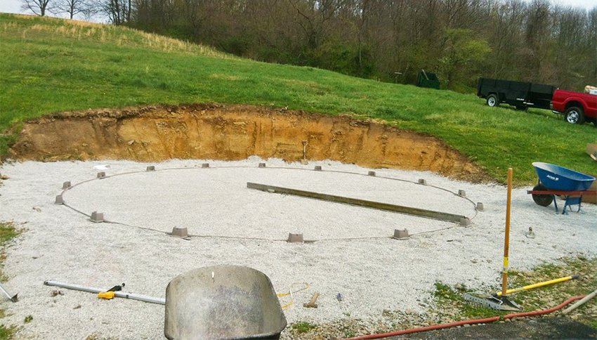Для хорошего распределения нагрузки мы готовим сухую смесь из 10 частей «грязного» щебня (ПГЧ) и одной части бетона марки 300, которую можно заменить легким сланцем, увеличив содержание вяжущего в 1,5 раза. Набиваем слой примерно 5-6 см, затем выравниваем рейкой по кругу. Утрамбовываем ступнями, добавляем смесь и снова разравниваем.