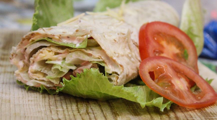 - Разложите на столе лаваш. Можно слегка смазать его майонезом и кетчупом (также можно обойтись без этих продуктов). Уложите кусочки мяса, овощи, капусту или листья салата. Добавьте при необходимости соль, любимые специи. Заверните лаваш. Блюдо готово!
