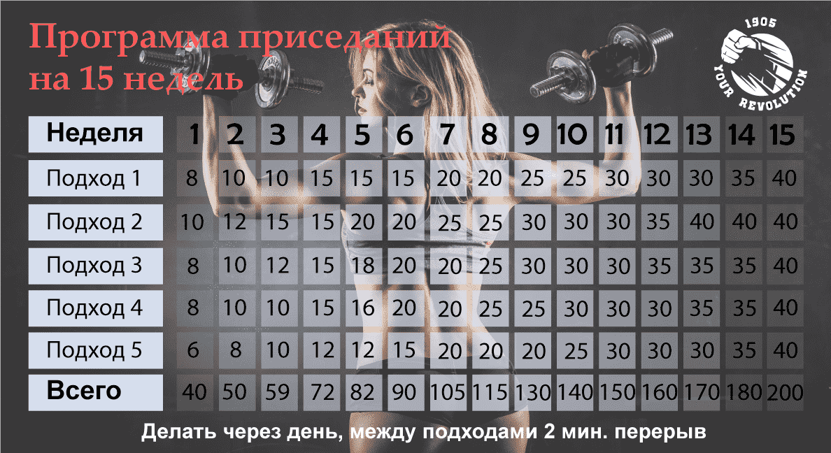 Оптимально выполнять по три подхода каждые 2 — 3 дня, комбинируя приседы с другими упражнениями