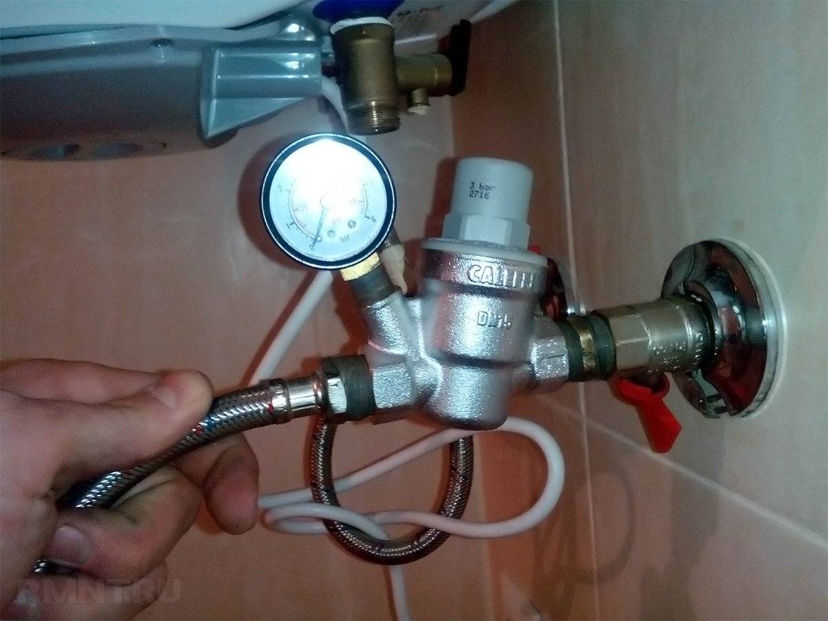 Подключите воду и проведите тестовый запуск. Процесс монтажа редуктора одинаков как для квартиры, так и для частного дома.