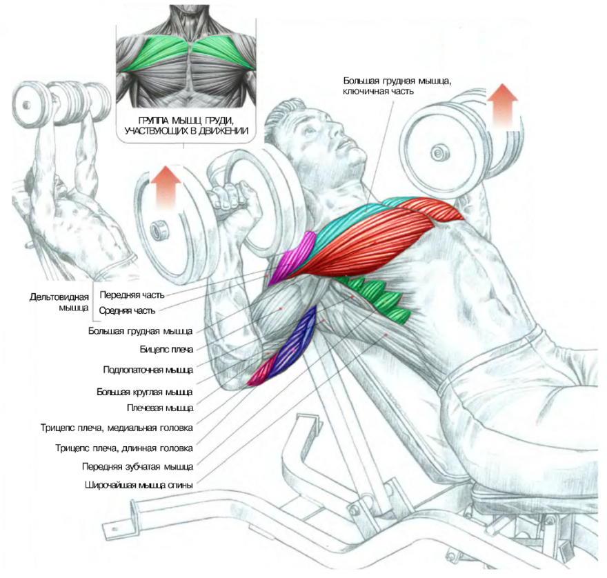 Жим гантелей на наклонной скамье в 30 градусов позволяет распределить нагрузку, которая при горизонтальном положении ложится на нижний пучок грудных.