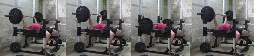 Установите штангу на стойку после выполнения упражнения 5х5 на силовые подъемы. Во время заключительного повтора поднимите вес от груди до тех пор пока не выпрямите локти. Затем, установите штангу на силовую раму. Как только вы коснетесь стойки, согните локти, чтобы опустить гриф на держатели.
