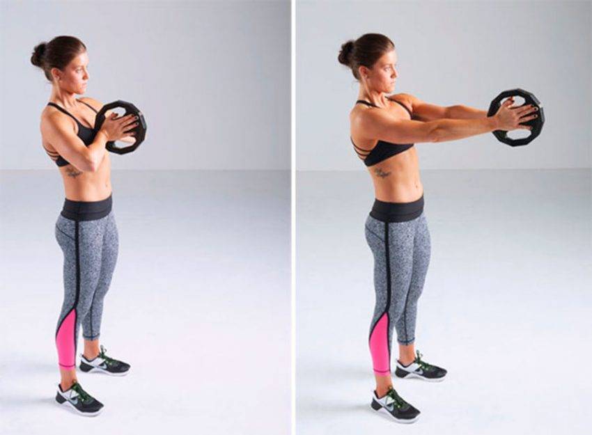 Начинать работу необходимо со снарядами небольшого веса, чтобы привыкнуть к движению и научиться чувствовать работу мышц в нем – с пары блинов по 1 килограмму, далее увеличивая вес дисков или их количество.