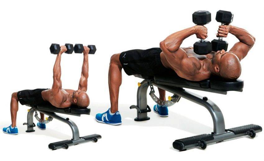 Еще один вариант жима гантелей лежа. Наклонное положение корпуса позволяет сделать акцент на нижних отделах грудных мышц. Уклон скамье следует установить равным 20-40 градусов.