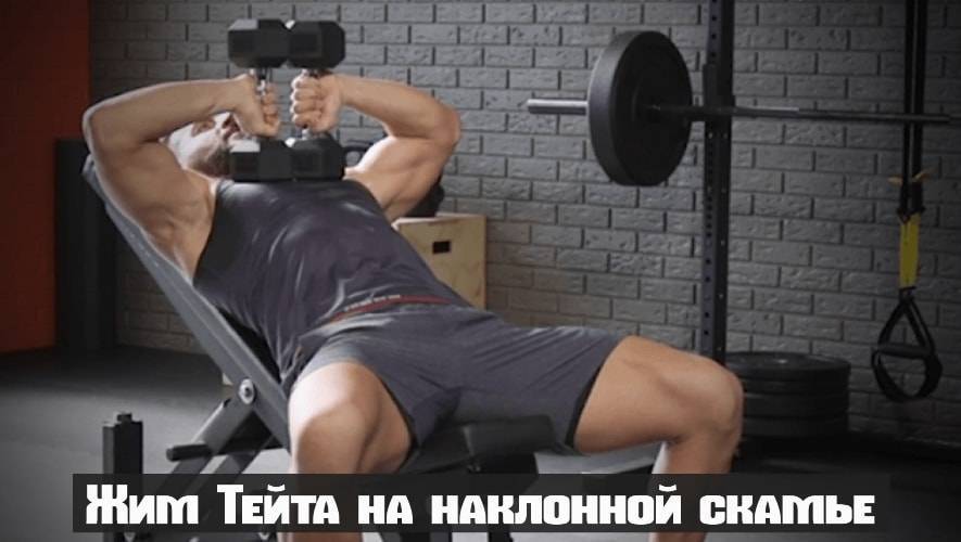 Классический вариант Жима Тейта, выполняется лежа на горизонтальной скамье. В качестве отягощения, используются гантели. Атлеты, которые тренируются дома, могут делать данный жим лежа на полу. Для более комфортного выполнения, подстелите под спину фитнес коврик. Перед тем как приступить к упражнению, стоит разобрать один технический момент с забрасыванием гантелей. Существует правильная технология как это сделать максимально безопасно.