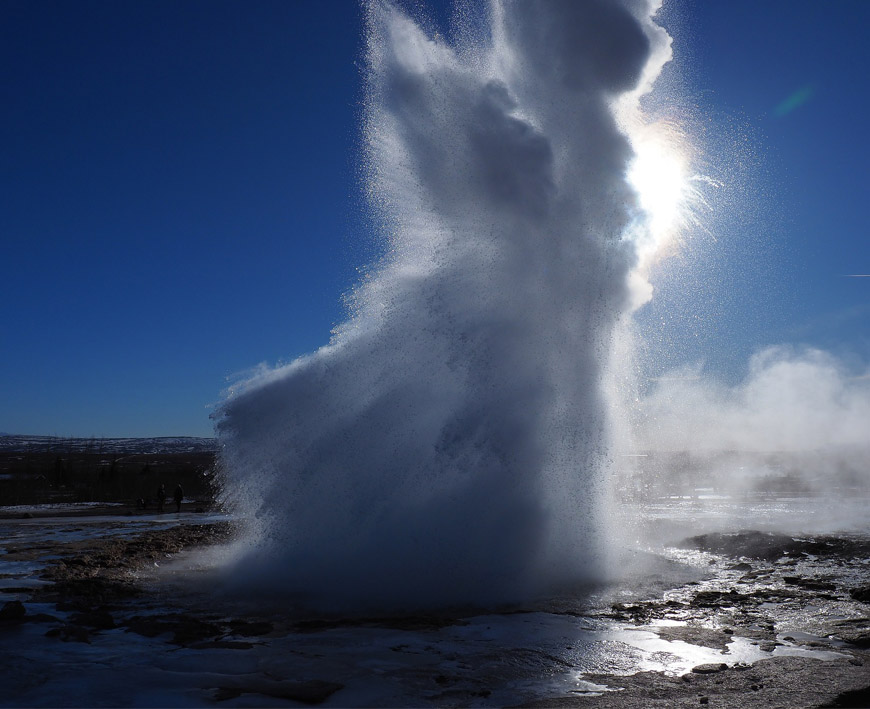 - Затем выброс прекращается, горячий пар исчезает, и гейзер переходит в состояние затишья. При этом можно увидеть уходящий под почву проток