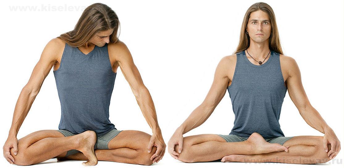 Асану следует разучить и в противоположном порядке, так, чтобы правая пятка лежала у промежности, а левая ступня – сверху, при этом правая кисть располагается под левой